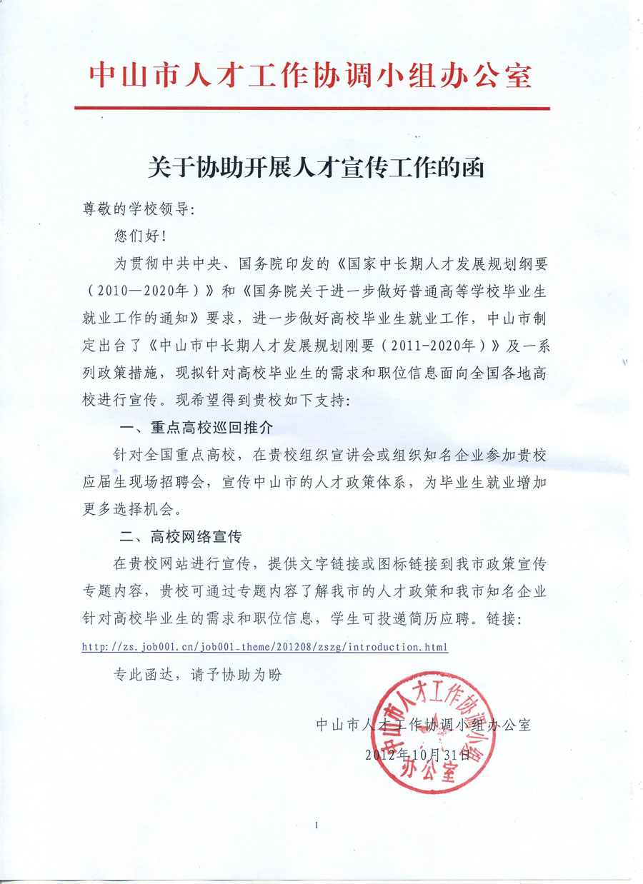 为贯彻中共中央、国务院印发的《国家中长期人才发展规划纲要(2010—2020年)》(以下简称《人才规划纲要》)和《国务院关于进一步做好普通高等学校毕业生就业工作的通知》要求,进一步做好高校毕业生就业工作,结合中山市为“十二五”时期发展需要强有力的人才支撑,中山市制定出台了《中山市中长期人才发展规划刚要(2011-2020年)》及一系列政策措施,搭建起“1+15”立体人才政策体系,培养人才,吸引人才,服务人才,留住人才。并搭建了网络平台,把中山市知名企业针对高校毕业生的需求和职位信息面向全国各地高校宣传。详细请进入链接查看:
