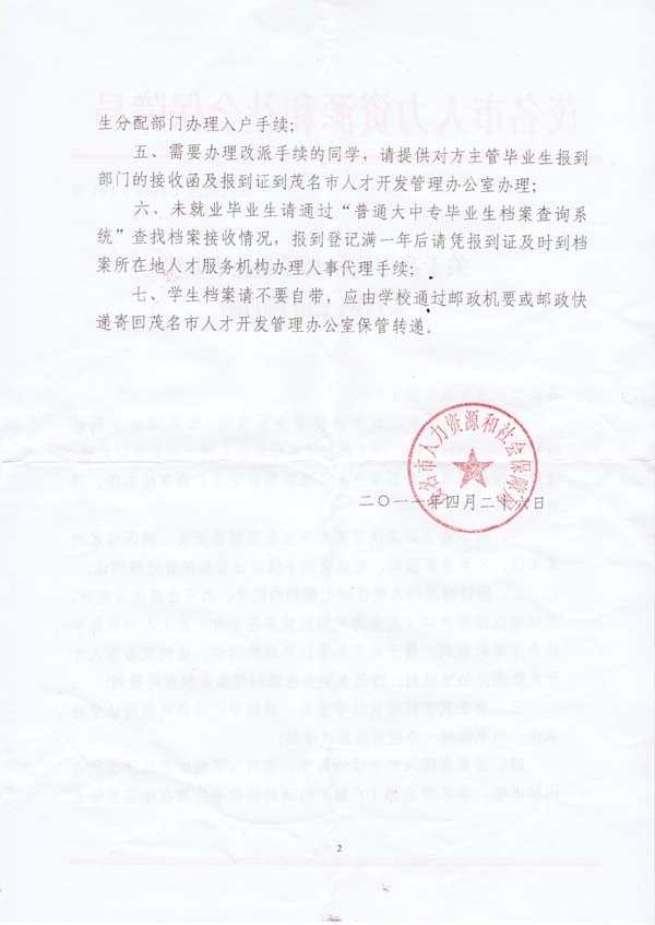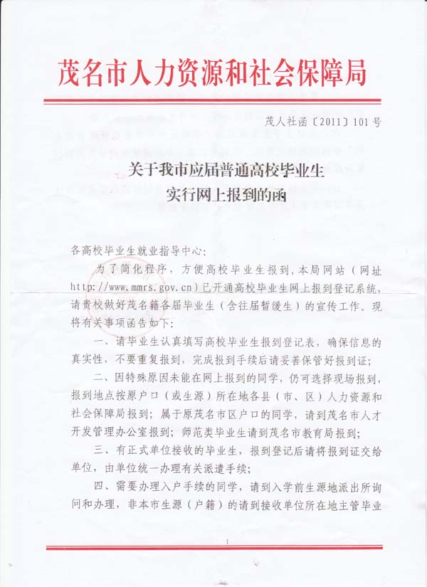 茂名市人力资源和社会保障局《关于我市应届普通高校毕业生实行网上报到函》
