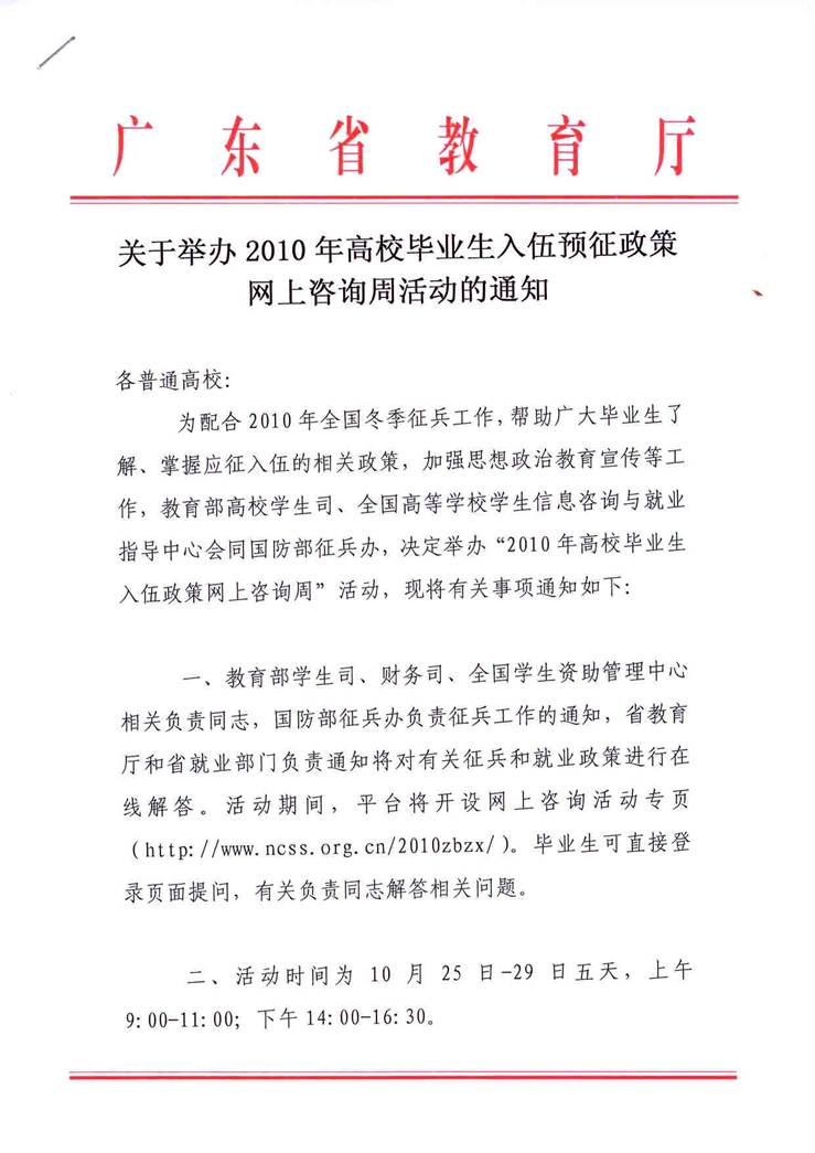 关于举办2010年高校毕业生入伍预征政策网上咨询周活动的通知